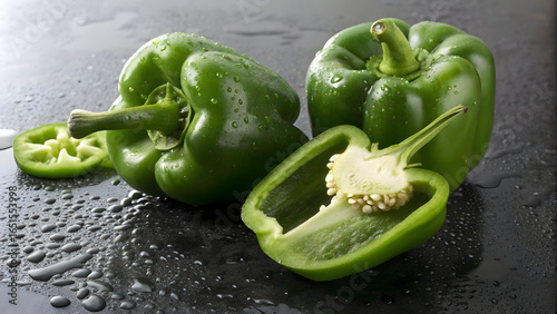 Three vibrant green bell peppers—smooth, glossy, and perfectly ripe—rest on a dark matte surface, glistening with fresh water droplets as if just rinsed