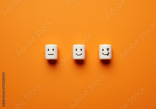 Three wooden blocks showing different facial expressions in a row on a vibrant orange surface