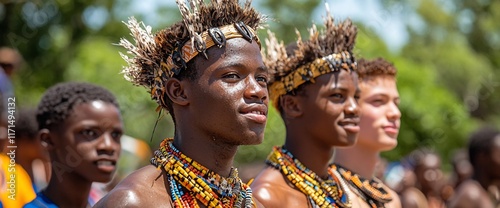 Three young men adorned in traditional African headdresses and beaded necklaces, looking thoughtfully towards the distance.