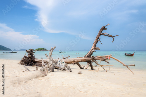 Timber wreck on the beach and blue sky at Koh Lipe province Satun in Thailand