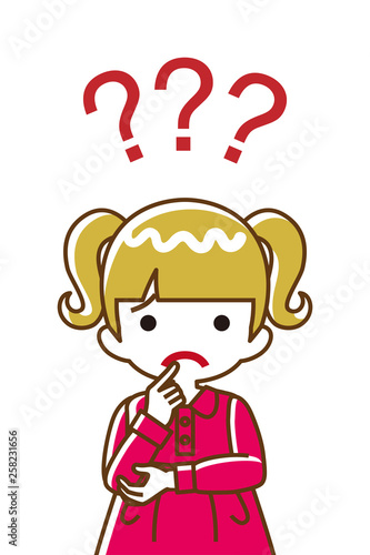 Toddler girl who has doubt something with three question marks -waist up, line art