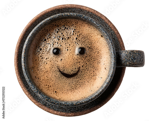 Top view of a coffee cup with frothy smiling face, isolated on transparent cutout background