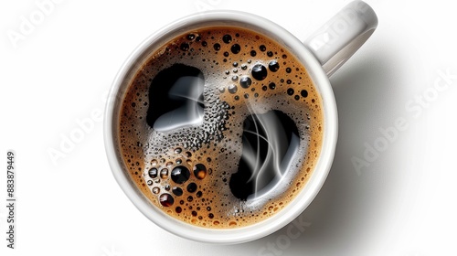 Top view of a steaming cup of black coffee in a white cup isolated on **** background.
