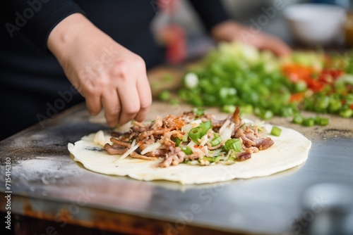 toppings being added to jianbing on griddle