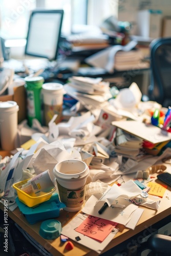 Toxic Workplace Desk with Cluttered Papers, Coffee Cups, and Stress-Inducing Items Reflecting Office Chaos