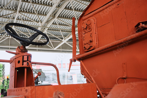 tractor operator's workplace with steering wheel and levers on an old orange tractor without glazing under the open sky