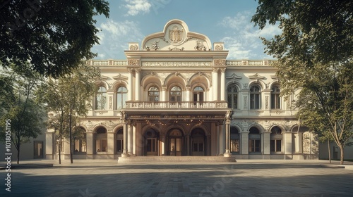 Traditional European theatre building with detailed architecture, no people. Room for copy in the foreground.