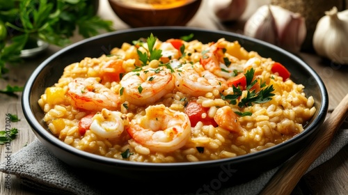 Traditional Italian risotto with seafood and vegetables. Featuring a creamy and rich dish. Highlighting the texture and flavors of the risotto and seafood. Ideal for food and gourmet themes.