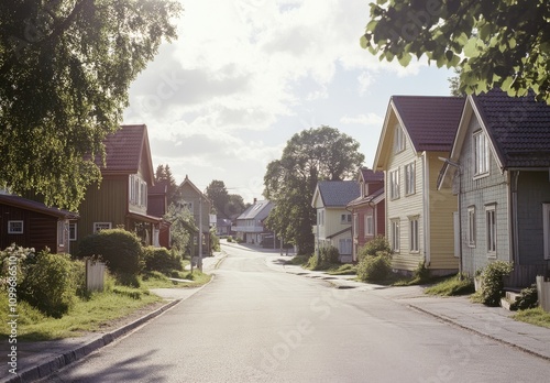 Tranquil Neighborhood Scene Featuring Colorful Wooden Houses and Lush Greenery Under Bright Blue Sky in a Charming Small Town