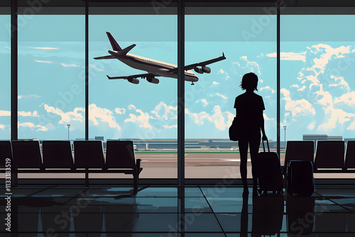 Traveler with luggage at airport terminal window watching airplane take off, symbolizing travel, exploration, and wanderlust, perfect for aviation, adventure, and journey-themed visuals