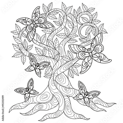 Tree and butterfly hand drawn for adult coloring book