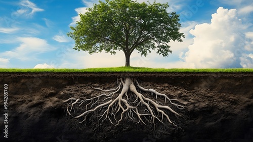 tree growing showing the roots deep and wide below the surface, growth