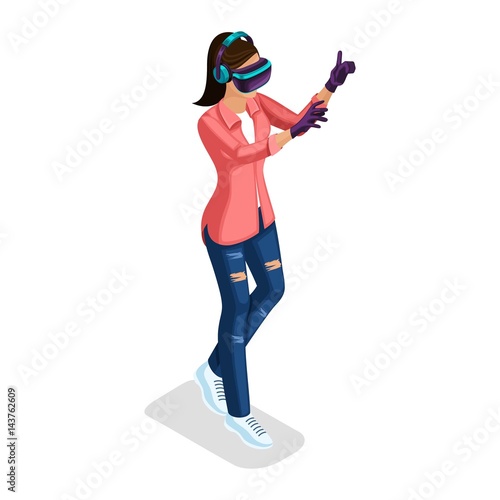 Trendy Isometric people and gadgets, a teenager, a young girl, student, uses hi tech technology, play, virtual world, virtual reality goggles, earphones, gloves isolated