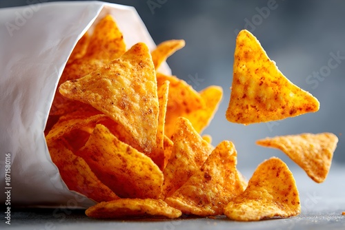 Triangle shaped corn tortilla chips spill from a white bag against a gray backdrop, showcasing their crispy texture and delicious flavor.