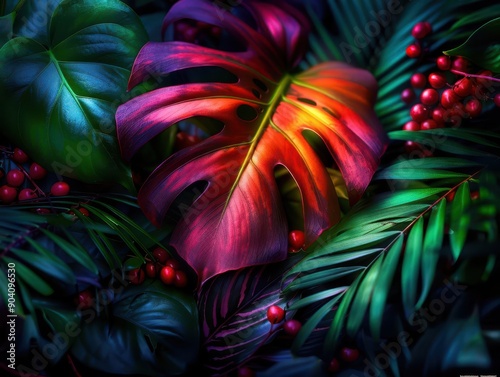 Tropical rainforest with dense foliage and exotic wildlife, Realism, Vivid hues, Photography