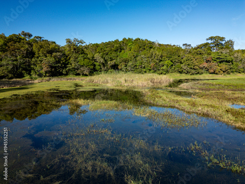 Tropical wetland featuring clear water reflecting green forest and a bright blue sky, showcasing the natural beauty and biodiversity of central america's ecosystems, Volcan, Panama - stock photo