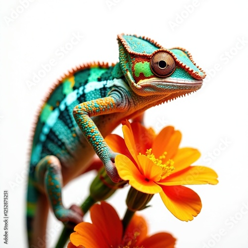 Turquoise Chameleon on Orange Flowers - Nature Photography