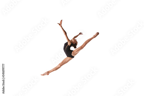 Twine in jump. Portrait of junior gymnast in black sport swimsuit doing gymnastics excercises isolated over white background. Sport, skills, achievements
