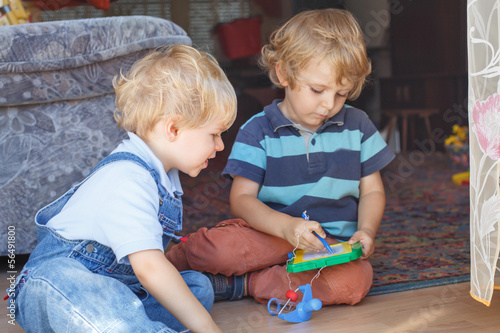 Two adorable little brother boy playing together indoor