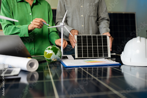 Two colleagues discussing data working and tablet, laptop with on Construction Site project.