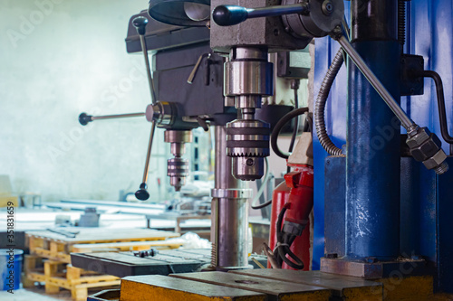 Two drilling machines close-up. Electrical equipment for Metalworking. Workshop equipment. Metalworking. Machine for drilling holes in metal structures.