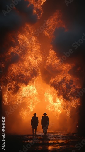 Two figures walk toward a blazing fire at night
