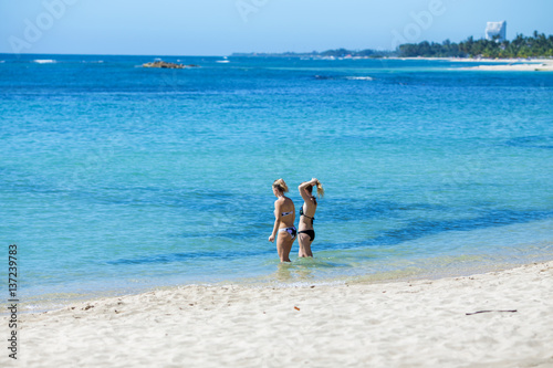 two girls going for a swim in the crystal clear blue sea