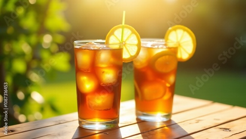 Two glasses of iced tea with fresh lemon slices, captured in warm sunlight with a lush green background. Perfect for summer, beverages, and outdoor refreshment themes.