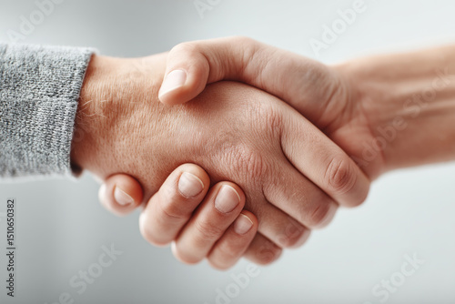 Two hands meet in a firm handshake symbolizing trust and agreement in a professional setting.