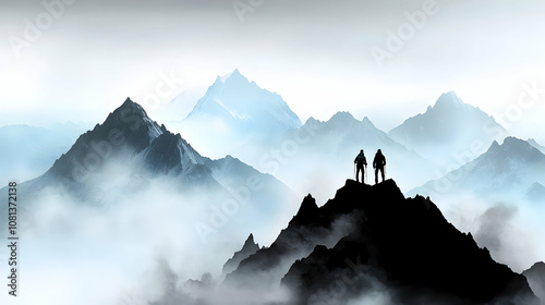 Two Hikers Contemplate Majestic Misty Mountain Range, Achieving Summit, Serene Landscape, Digital Painting