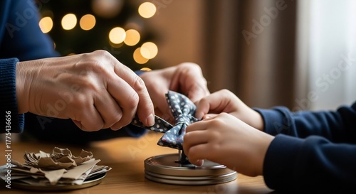 Two individuals craft a spotted bow on a metal stand at a wooden table with a lit Christmas tree in the background