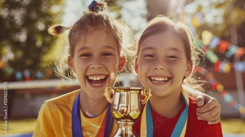 Two joyful children with bright smiles proudly hold a golden trophy, celebrating a winning moment under colorful outdoor lights.