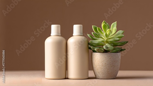 Two minimalist cosmetic containers stand beside a potted succulent plant against a muted background