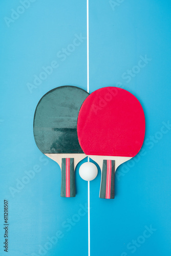 Two table tennis or ping pong rackets and balls on a blue table