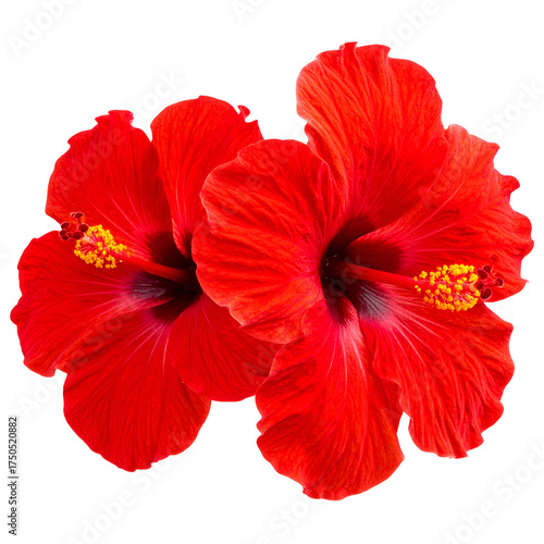 Two vibrant red hibiscus flowers, with yellow stamens, against a black background