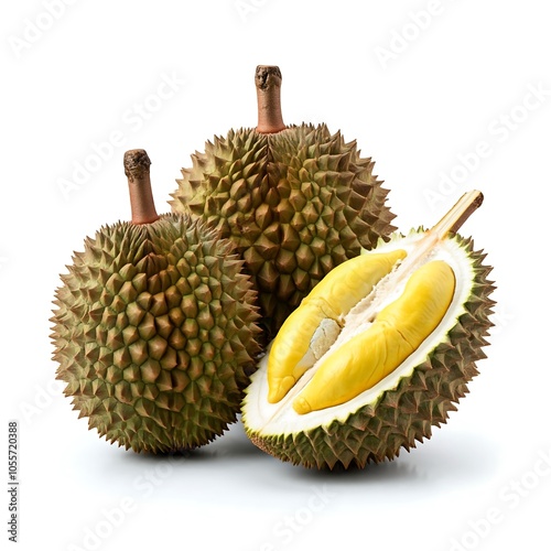 Two whole durians and one opened, showcasing vibrant yellow flesh against a white background. No actions, delicious, tropical.