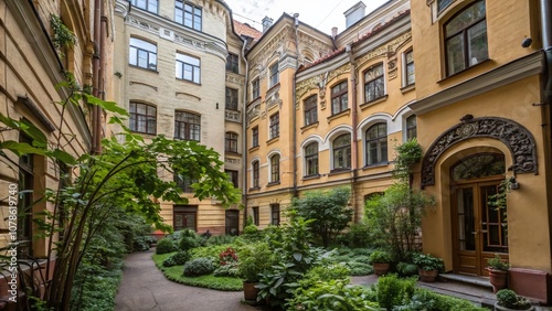 Typical view of a residential building from a serene courtyard in St Petersburg with vibrant greenery and historical architecture, showcasing the charm and elegance of Russian urban living.