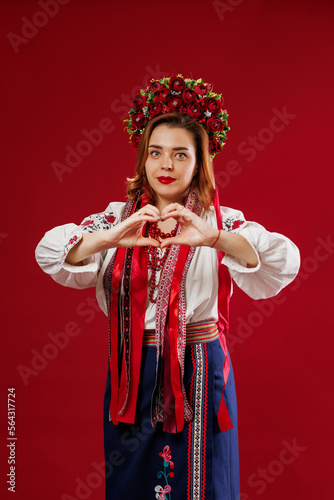 Ukrainian woman in traditional ethnic clothing and floral red wreath on viva magenta studio background with hands showing a heart shape. Ukrainian national embroidered dress call vyshyvanka