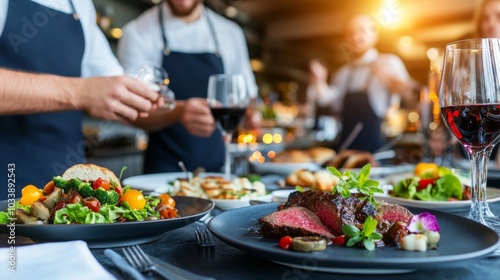 Un grupo de chefs sirviendo platos de carne y ensaladas en un elegante restaurante, con copas de vino tinto y luces cálidas de fondo.