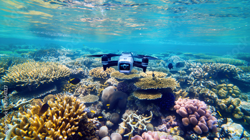 Underwater drone exploring a vibrant coral reef with diverse marine life in clear waters.