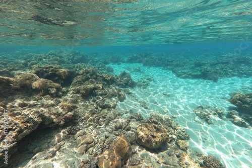 Underwater scene with rocks, sand, and sunlit, clear, turquoise water