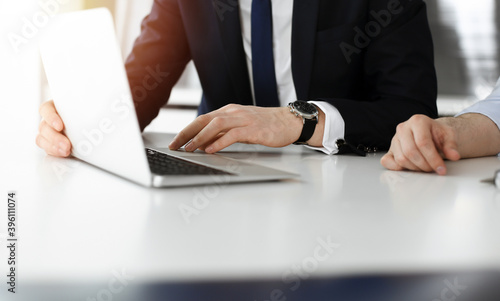 Unknown business people using laptop computer at the desk in modern office. Businessman or male entrepreneur is working with his colleague. Teamwork and partnership concept