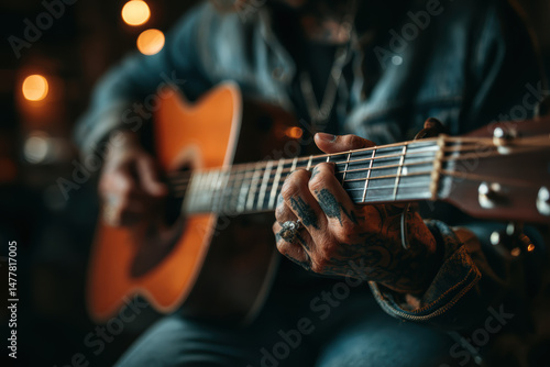 Unrecognizable Caucasian man indoors tuning an acoustic guitar, front view, with focus on the musician is hands and guitar, capturing the artistry of music