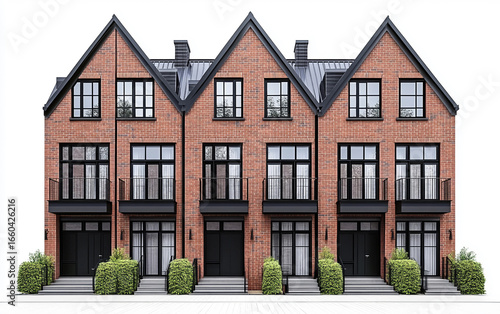 Urban townhouse with brick facade and black window frames showcasing modern residential design isolated on white background PNG