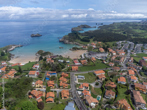 Vacation on Green coast of Asturias, aerial views of Celorio village with sandy beaches, North of Spain