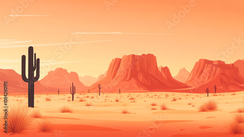 Vast desert landscape with cacti and mountains during sunset in a serene environment