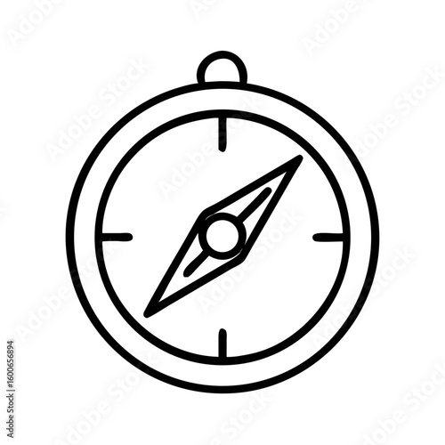 Vector art of a simple black and white outline illustration of a compass with a needle pointing towards north on a white background