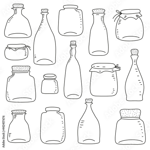 Vector collection with pots and bottles in hand drawn style isolated on a white background.