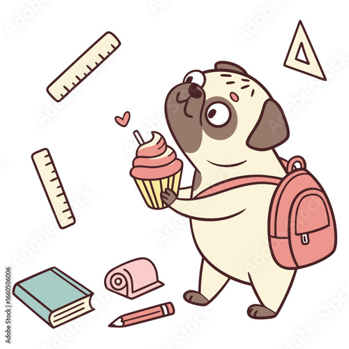 Vector illustration of a Curious Pug with holding a cupcake, styled in a Back to school theme using Chalkboard Fun colors