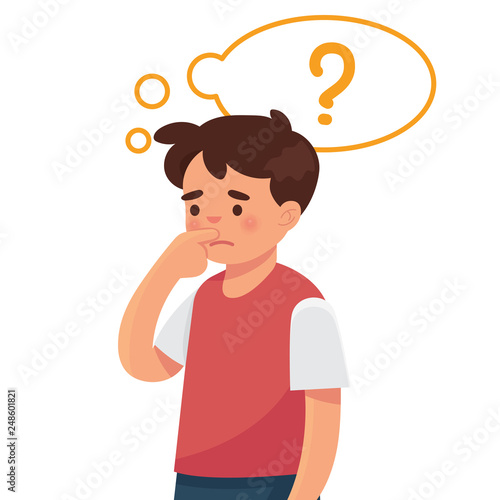 vector illustration student boy is thinking with bubble words and question sign
